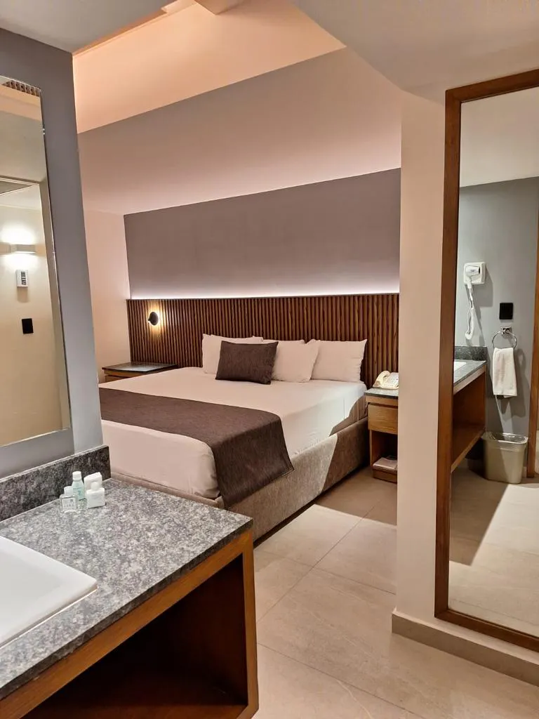 Habitación Superior con cama King Size, recientemente remodelada, diseñada para brindar confort y funcionalidad en un entorno moderno. Cuenta con mobiliario de alta calidad, tecnología actual y baño privado, ideal para estancias de negocios o descanso en Guadalajara.